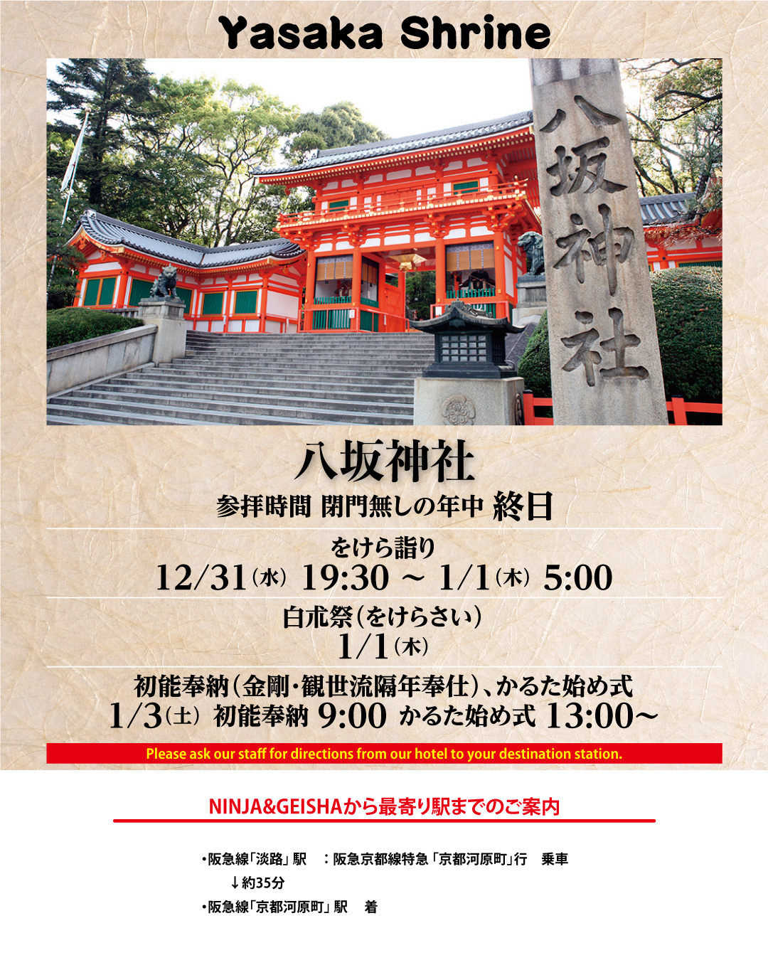 2025.12.16 ご案内 初詣へ行くなら八坂神社! NINJA&GEISHAから八坂神社への行き方をご案内いたします! ========================================= ◇阪急線「淡路」駅:阪急京都線 特急「京都河原町」行 乗車 ↓約35分 ◇阪急線「京都河原町」駅 到着 ========================================= ご宿泊者さまでしたらチェックイン前でもお荷物のお預かりが可能です。 身軽にして初詣をお楽しみください!