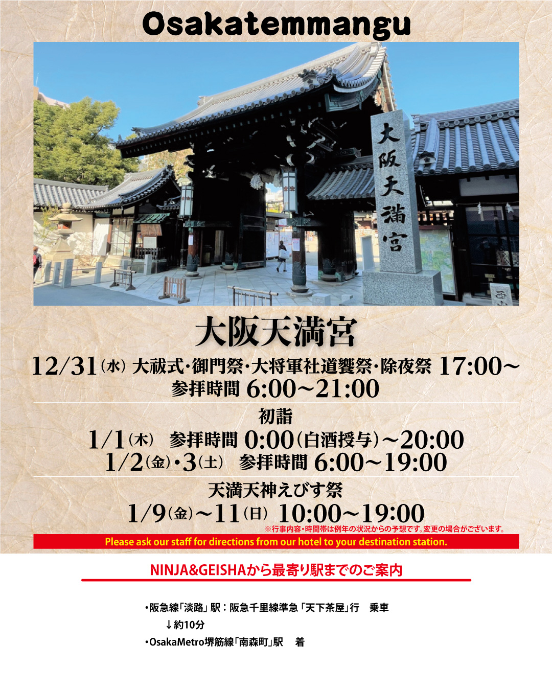 NINJA&GEISHAから大阪天満宮への行き方をご案内いたします!